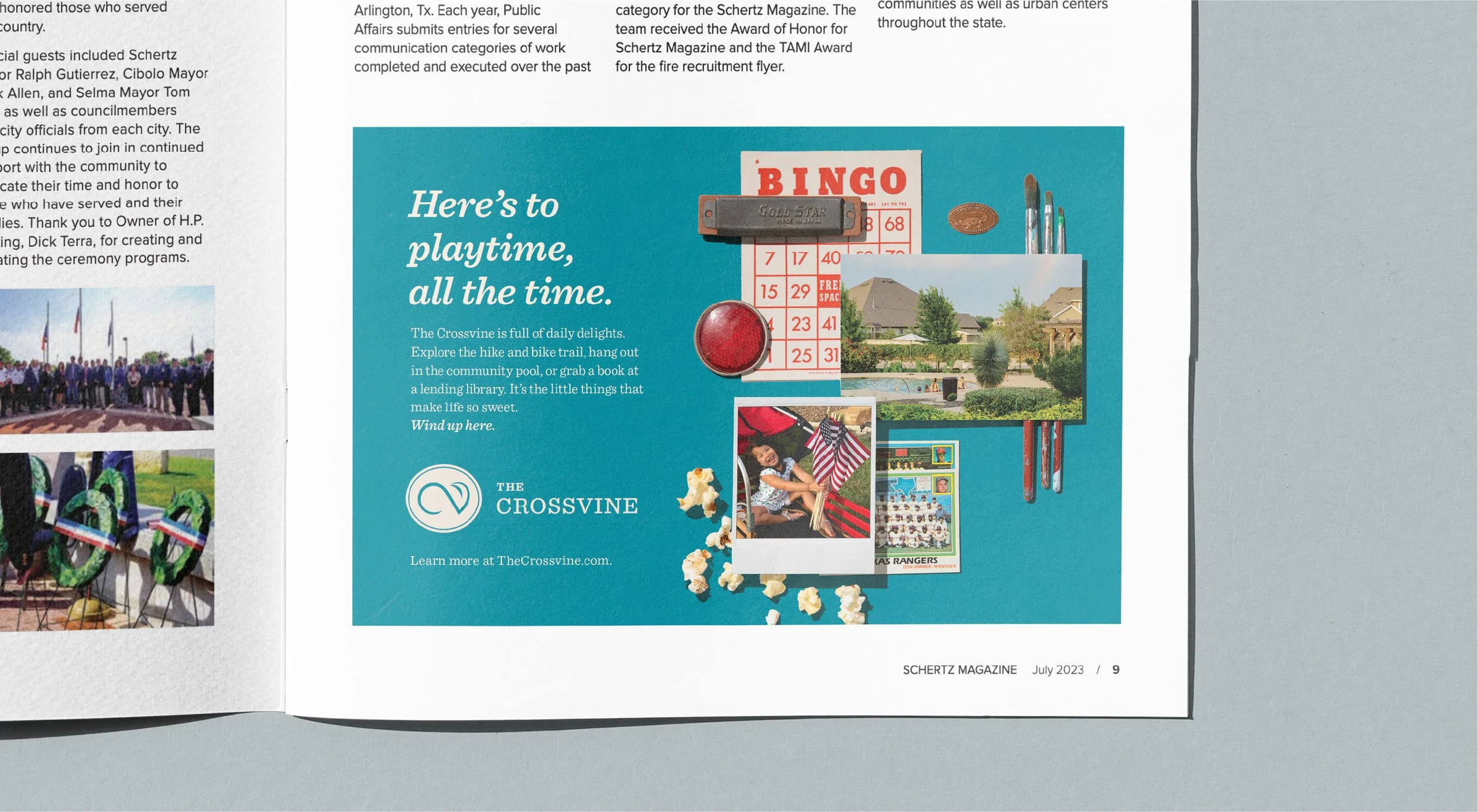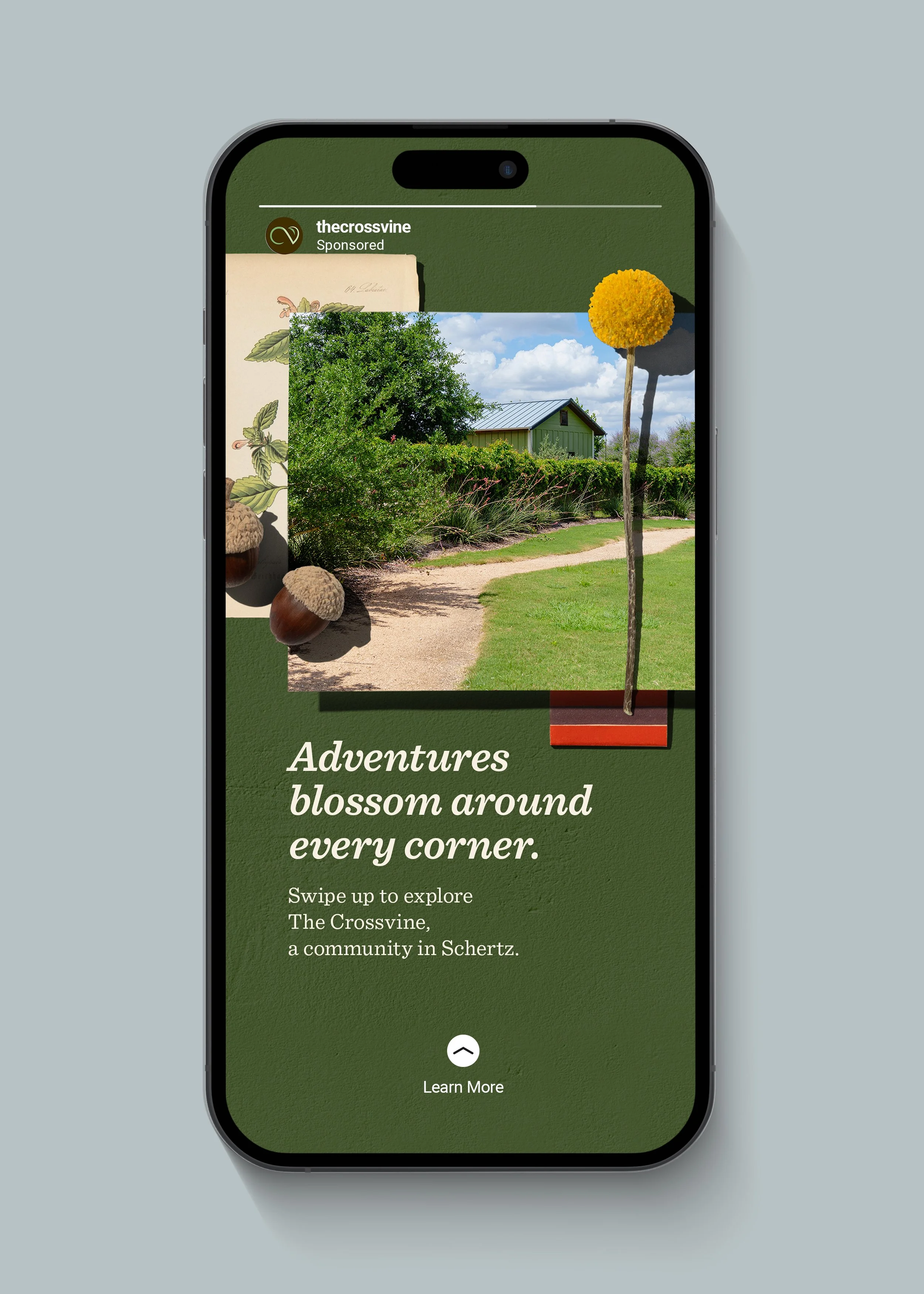 Art direction for The Crossvine, a community in Schertz, outside of San Antonio. Nostalgic and variable collages with ephemera reflecting the neighborhood’s variety of life.